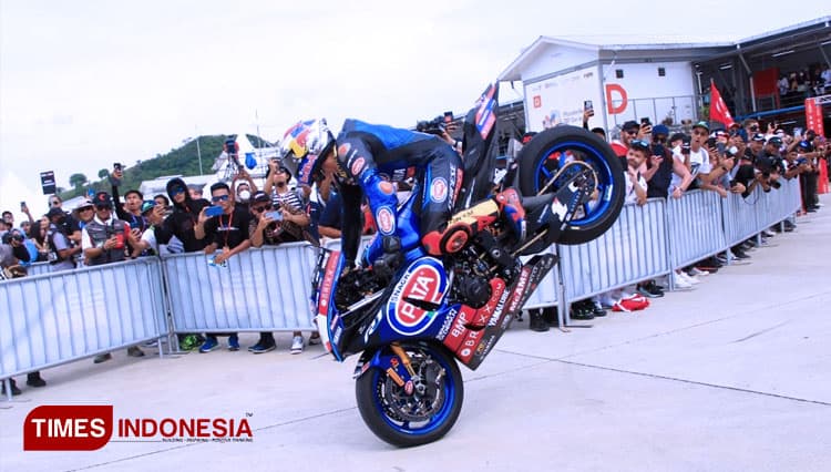 TIMES Palu/Pembalap PATA Yamaha Brixx Toprak Razgatlioglu melakukan atraksi stopie ban depan usai memenangi race 1 WSBK Mandalika 2022, Sabtu (12/11/2022). (FOTO: Tria Adha/TIMES Indonesia).